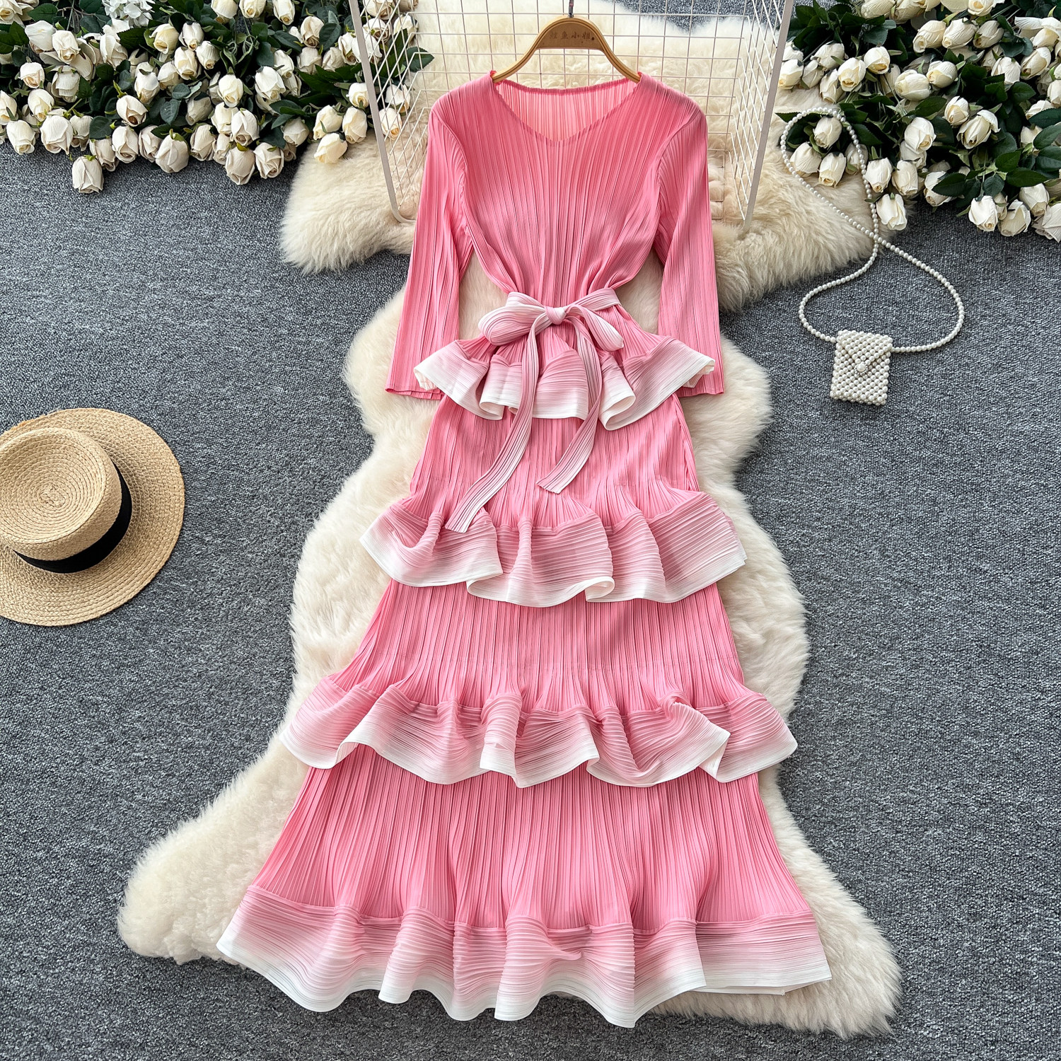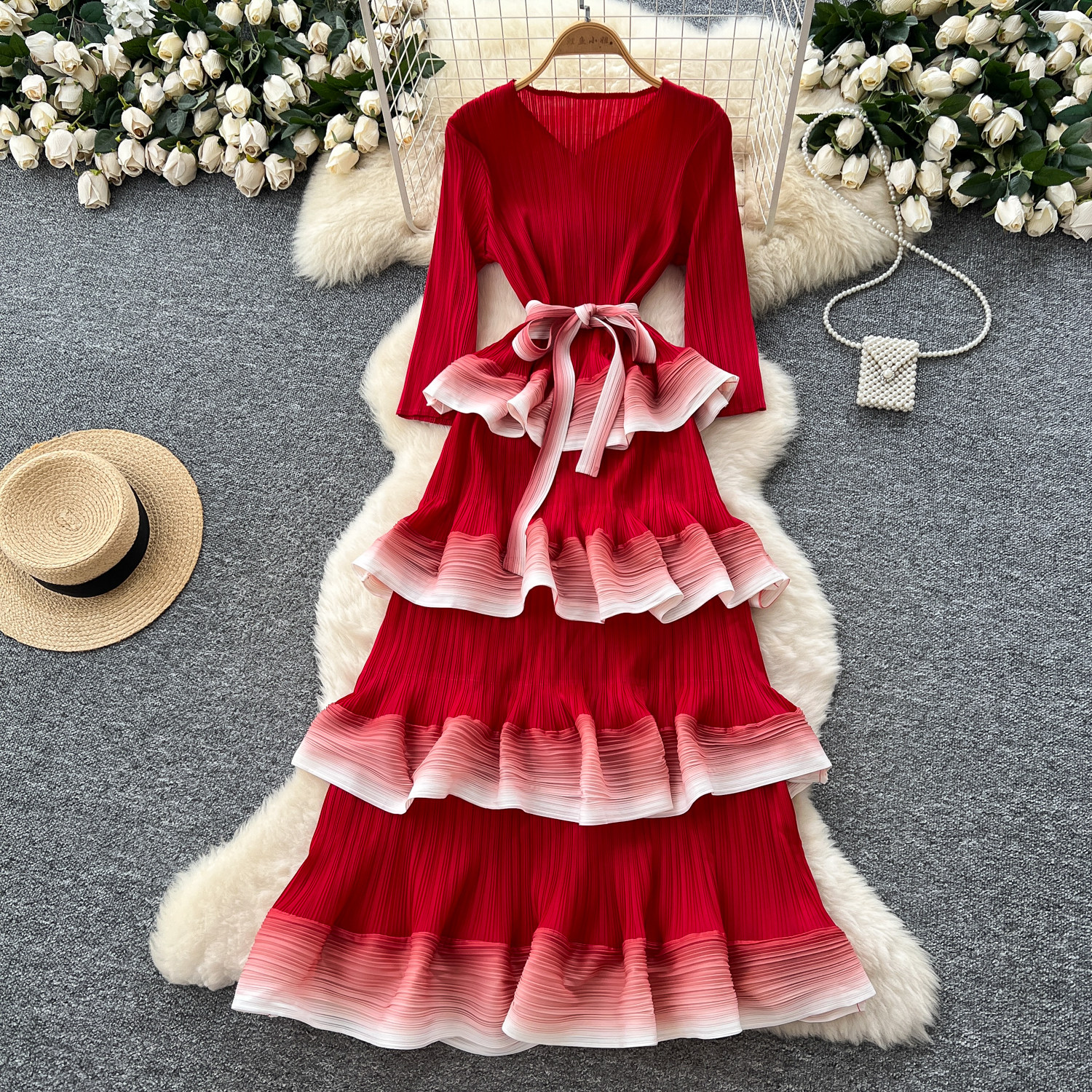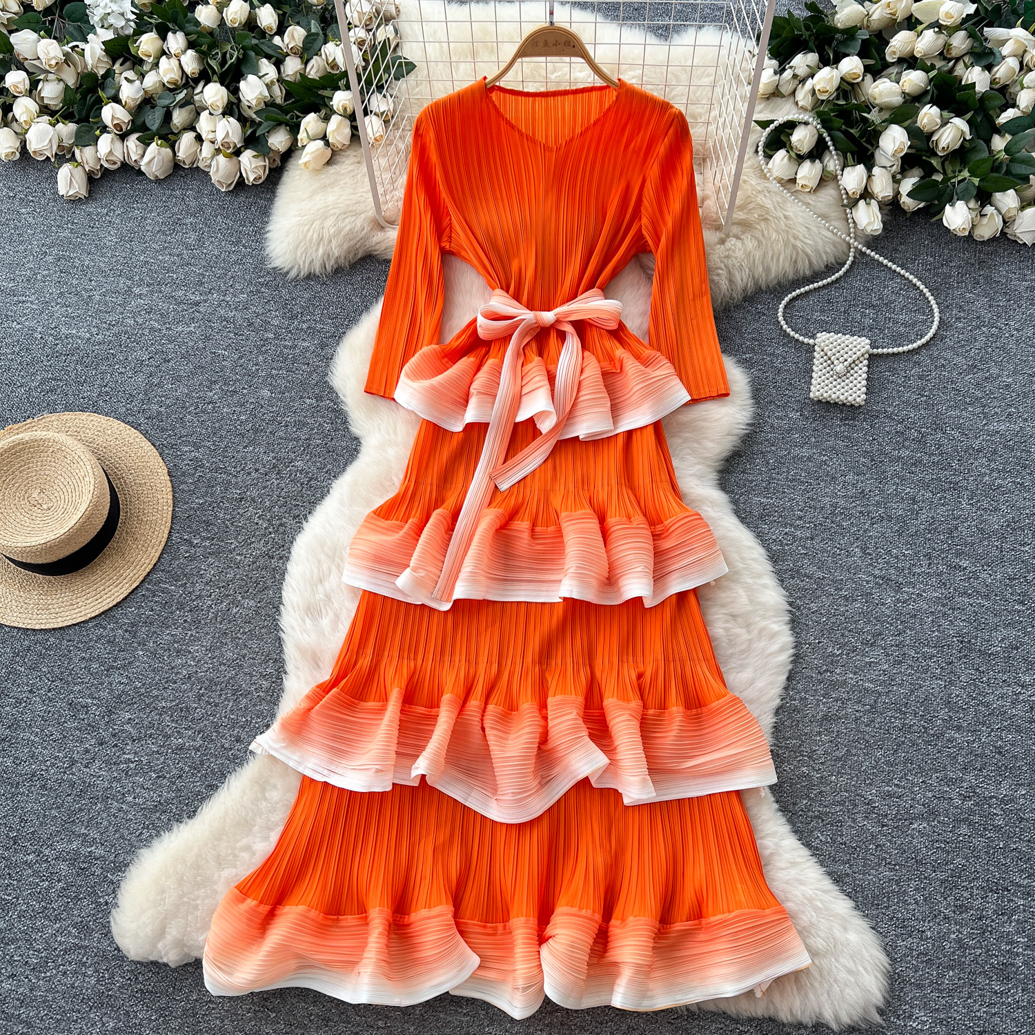 Retro pleated, high-end feel, tie-waist, gradient color, ruffled pleated long skirt for women